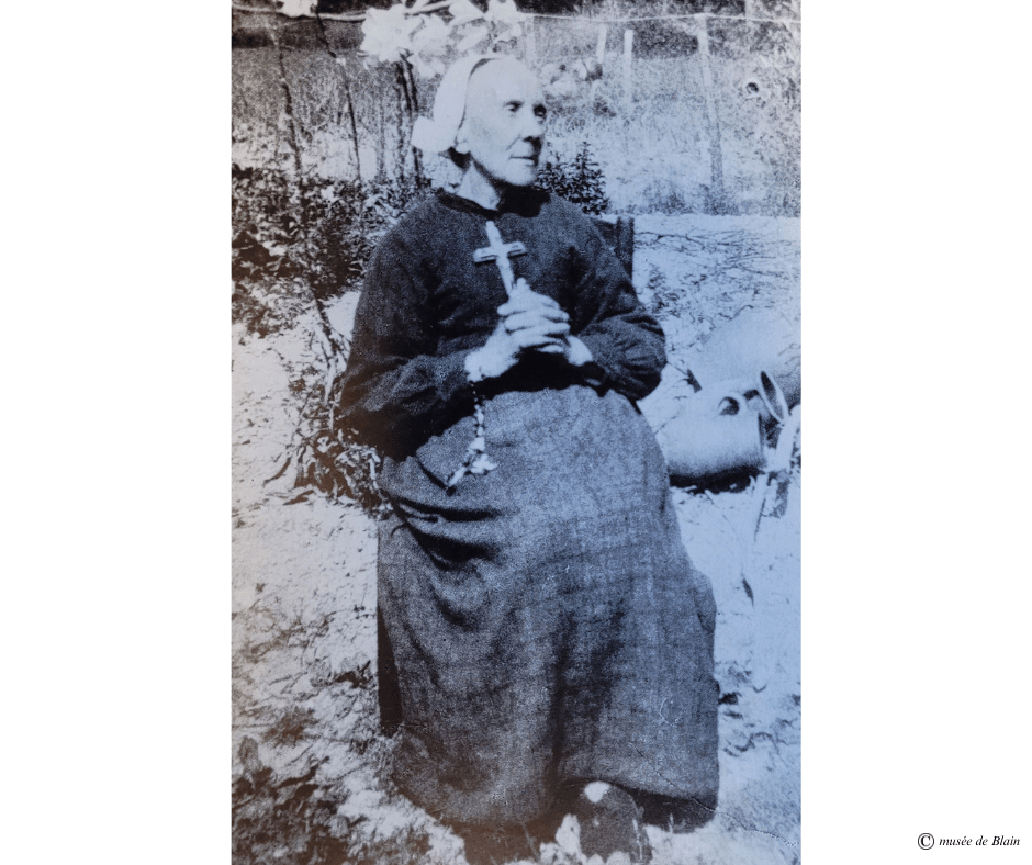 👉Il s’agit de Marie-Julie Jahenny. Marie-Julie Jahenny est une mystique et stigmatisée catholique française, née le 12 février 1850 à Blain et morte le 4 mars 1941 au hameau de La Fraudais. Dénommée « la sainte de Blain » par ses fidèles, elle revit, chaque vendredi, à partir de 1873, la Passion du Christ et en porte les stigmates.