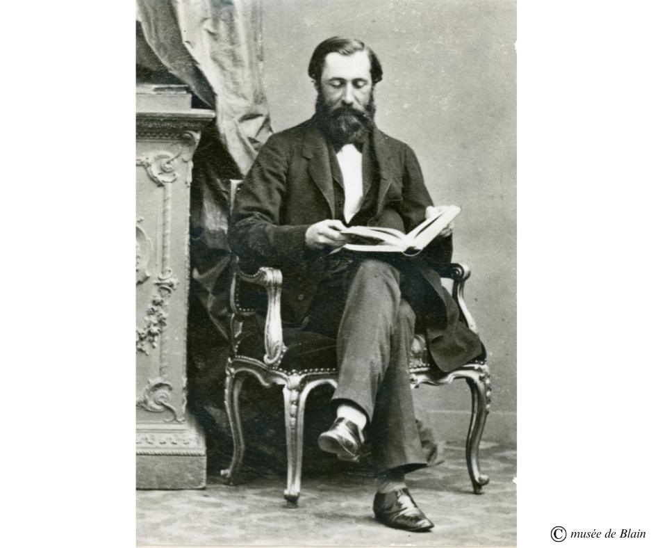 👉Il s’agit de Jules Revelière. Il est né en 1831 et est décédé en 1907. Receveur de l’enregistrement à Blain, il fut le digne successeur de Louis Bizeul. Aussi modeste qu’érudit, il s’intéressait à tout : sciences naturelles, arts, ou encore la littérature. Le musée de Blain lui doit beaucoup. La quasi-totalité des objets gallo-romains présentés au musée proviennent des recherches qu’il a effectués à Blain entre 1890 et 1907. Le compte rendu de ses collections est publié en 1903 dans un ouvrage intitulé « Notes archéologiques sur Blain ». C’est grâce à la générosité de cette famille, particulièrement à Mademoiselle Annick Revelière (petite fille de Jules) que la salle Gallo-Romaine est ouverte à la visite dans votre musée. N’hésitez pas à venir la découvrir !
